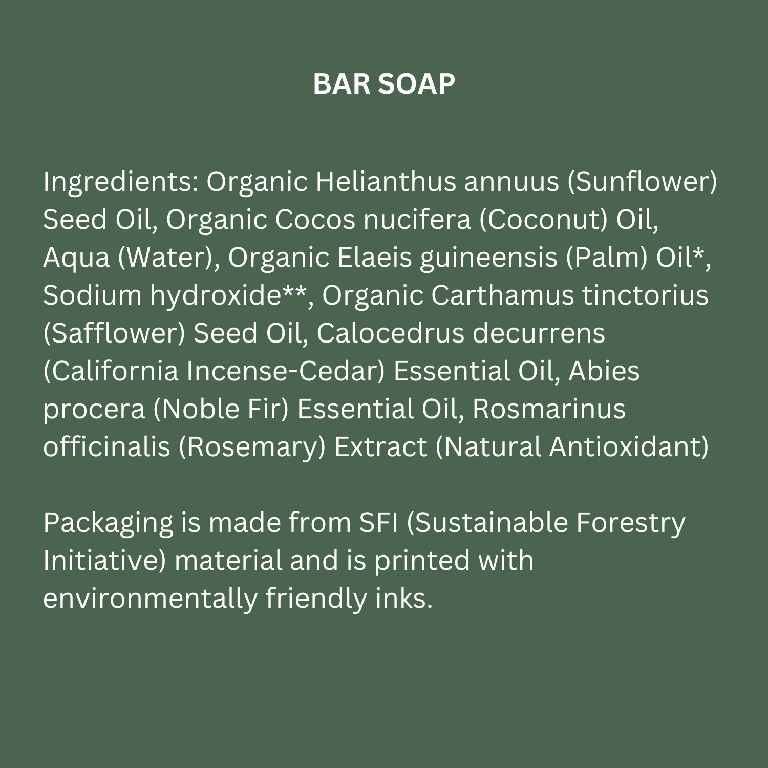 Cleansing and refreshing Big Sur Bar Soap is a 100% plant based Bar Soap that transforms your shower into an aromatic snapshot of the fog crawling up the steep granite cliffs to forests full of Monterey pines and black sage flowers--not to mention the queen of the California coast, the towering coastal redwood.