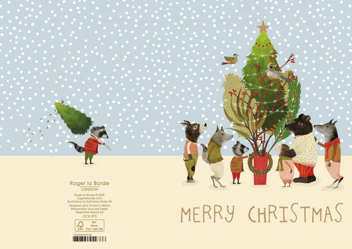 Beautifully illustrated greeting card embellished with lashings of gold-foiling. Cute creatures gathered around a lovely Christmas tree, artwork by Katherine Quinn.