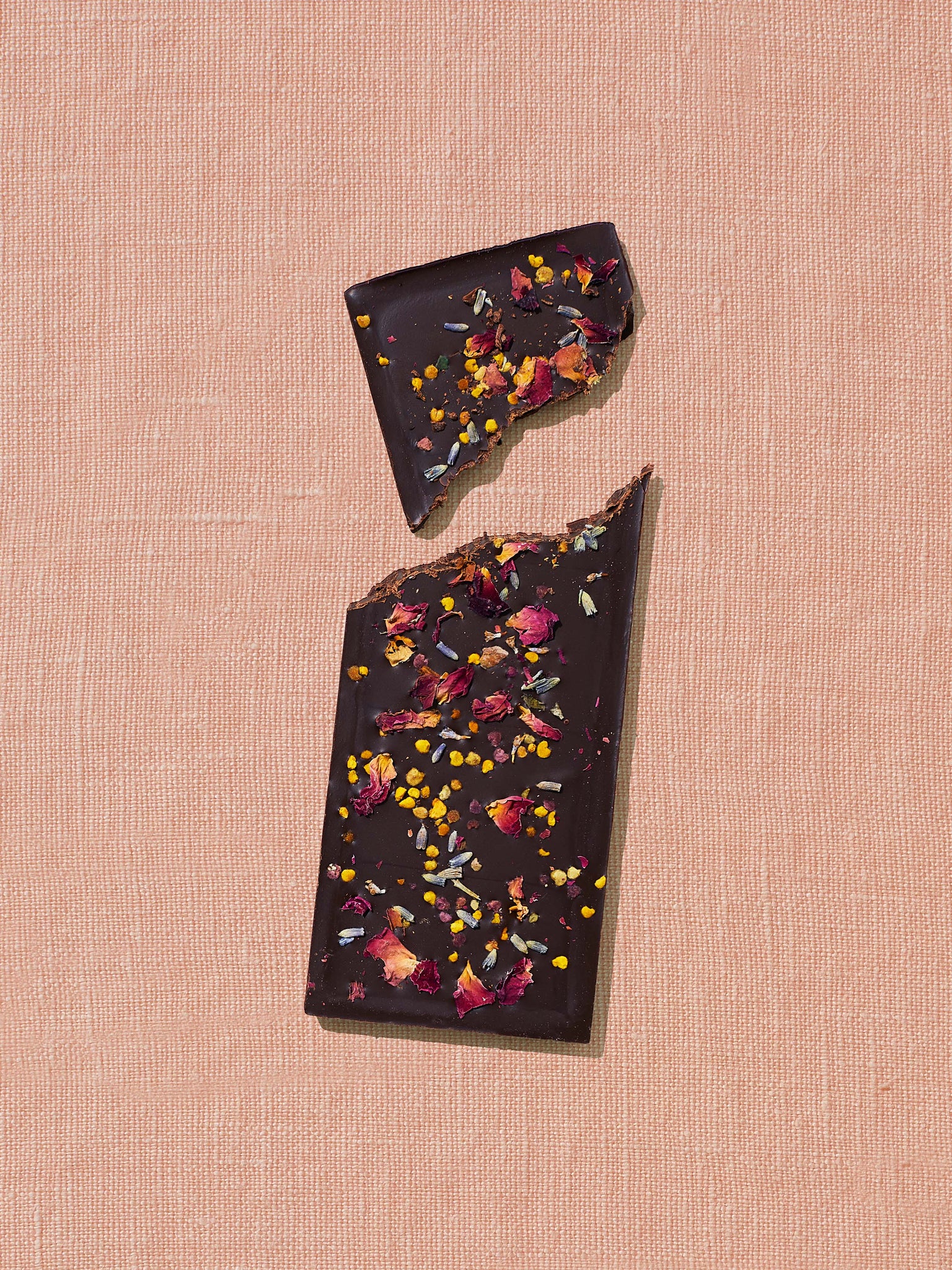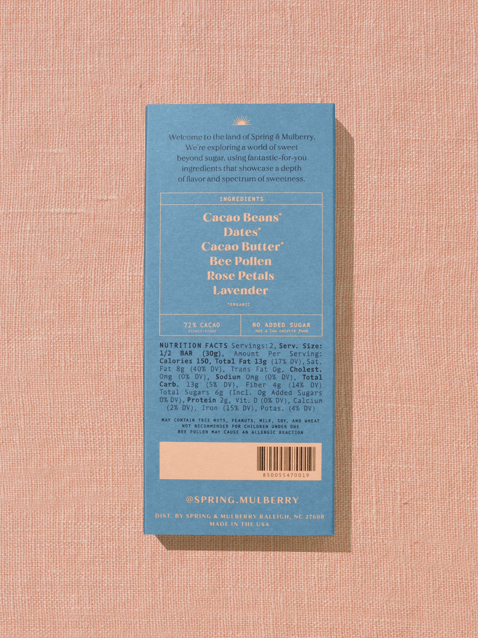 A fragrant trio of wild lavender, bee pollen, and hand-picked rose petals come together with the richness of date-sweetened dark chocolate to create a soothing, subtly sweet treat reminiscent of spring.
