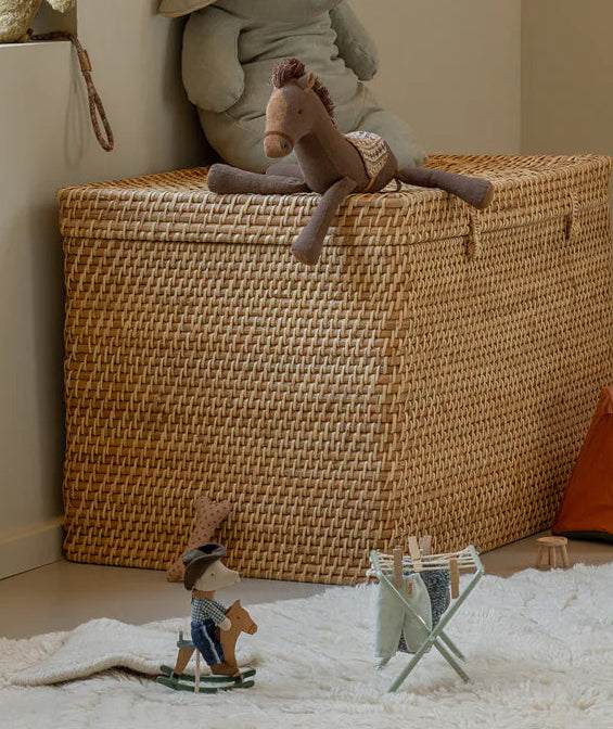 A knitted saddle rests gently across its back, ready to carry little friends on imaginative journeys.