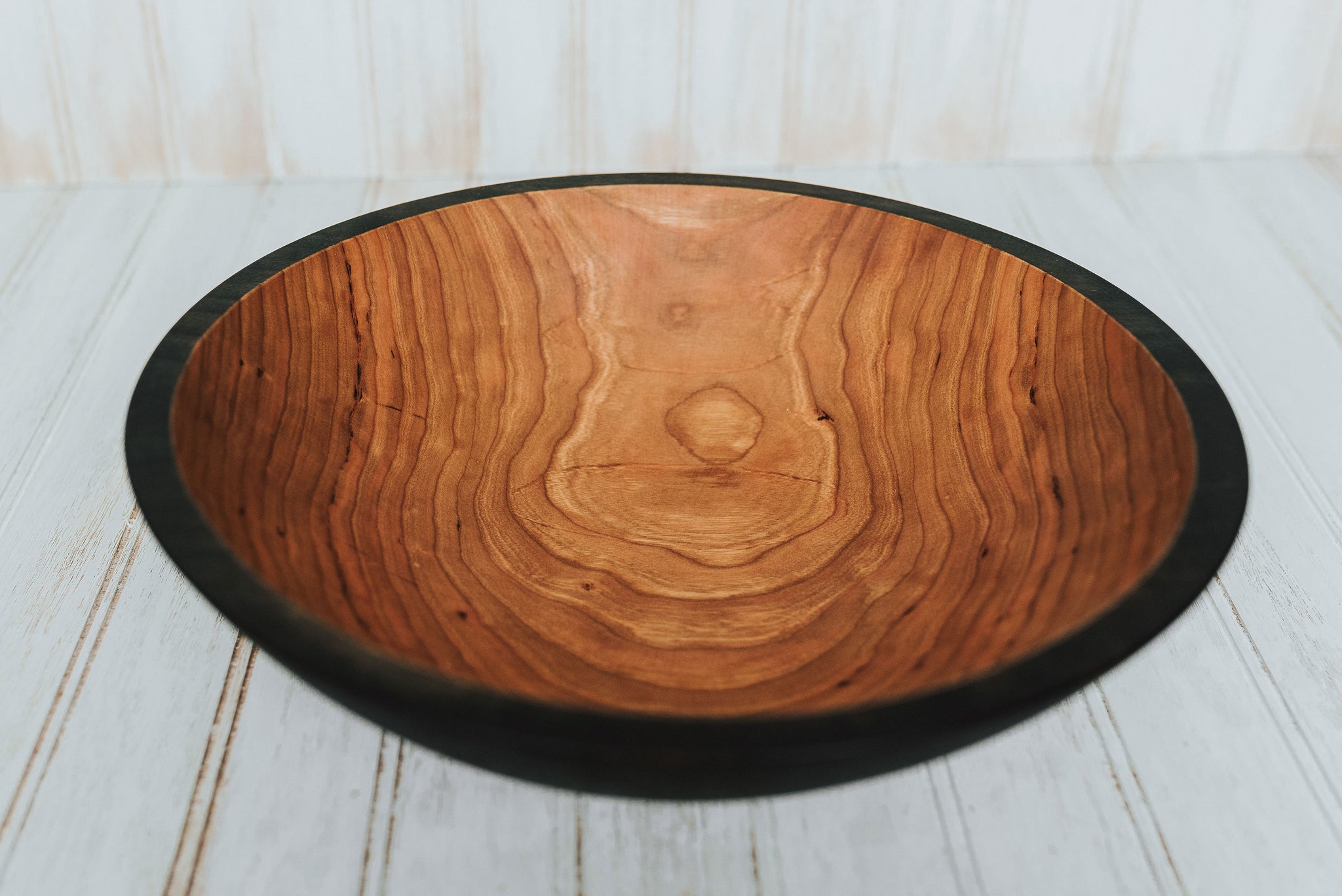 This spectacular solid Ebonized Cherry wood bowl is turned by the craftsmen at the Holland Bowl Mill, one of the last commercial wood bowl mills in production in the United States.